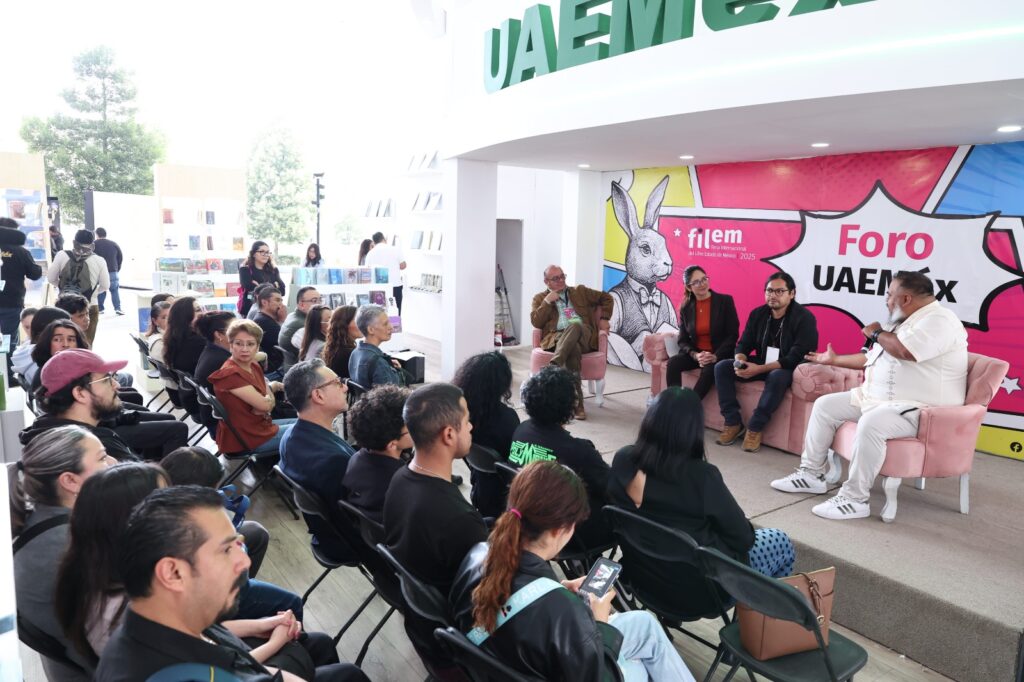 En el Foro UAEMéx de la FILEM, acompañada por el director de Publicaciones Universitarias, Jorge Robles Álvarez, y el moderador, Humberto García Neri, la secretaria de Identidad y Cultura de la institución educativa, Cynthia Ortega Salgado, destacó que en esta edición se reconoce la trayectoria de un talento universitario egresado de la Licenciatura en Diseño Gráfico de la Facultad de Arquitectura y Diseño, quien suma importantes reconocimientos nacionales e internacionales, consolidándose como un referente en el ámbito de la novela gráfica para infancias y juventudes.